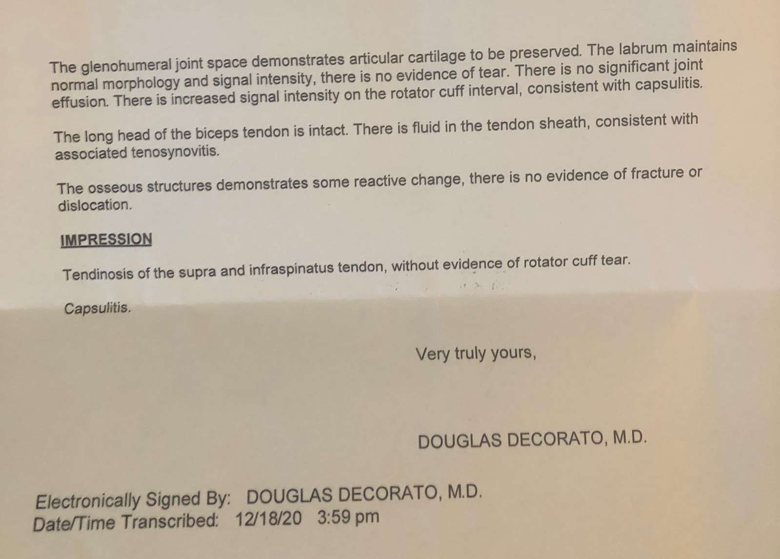 In December I get an MRI. This shows no tearing of the rotator cuff (am so grateful for that).